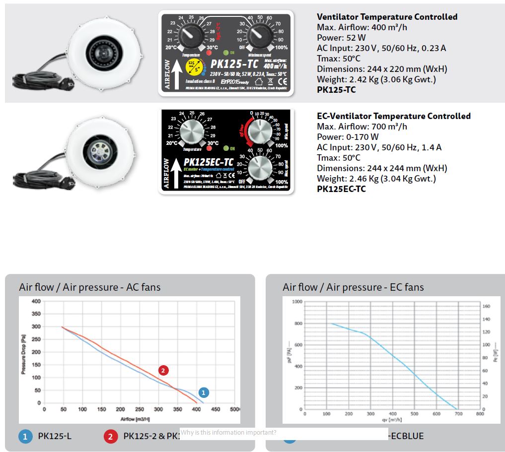 Primaklima PK 125 TC je napreden cevni ventilator z integrirano TC (temperature + speed control) regulacijo, ki dinamično prilagaja hitrost glede na temperaturo zraka. Namenjen je optimalnemu prezračevanju v growboxih, rastlinjakih in manjših notranjih sistemih, kjer je uravnavanje toplote in pretoka ključno za rast rastlin ali stabilno klimatsko okolje.